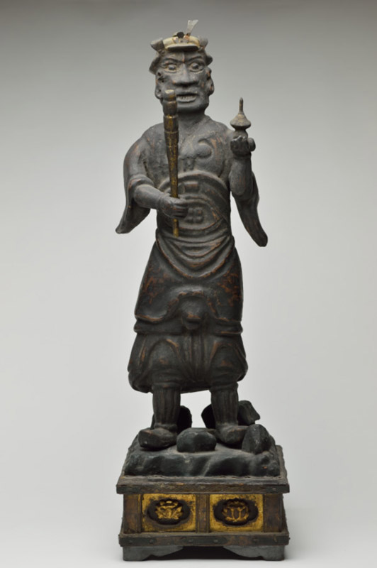 Traditionally, Bishamonten is widely known as one of the Seven Lucky Gods of Japan, a god of warriors, but not a war deity itself. He is associated with the north, winter, the color black, treasure, centipedes, and the human action of faith. His origins can be traced back to India, where he is known as Vaiśravaṇa. Bishamon is always depicted as dressed in full armour, carrying a spear and a miniature pagoda. He is the protector of the righteous and is the Buddhist patron of warriors.
