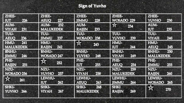 There are eight months in the Calendar of Mu, sometimes referred to as the Nyarzirian Calendar. Each month consists of forty-five days and represents a system of the eight hexagrams moving through the five elements. The chart below illustrates the daily Vasuh letters invoked and the ruling “deity” for the said hexagram: