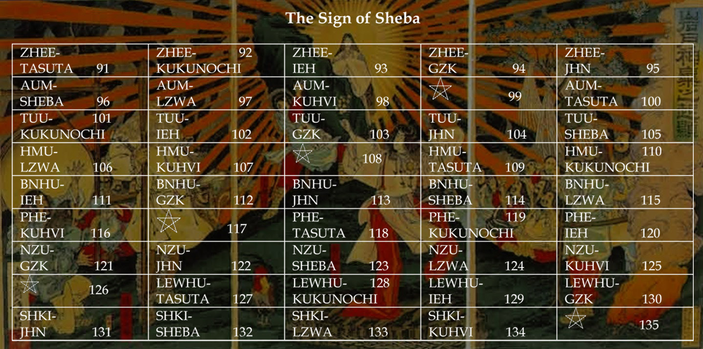 There are eight months in the Calendar of Mu, sometimes referred to as the Nyarzirian Calendar. Each month consists of forty-five days and represents a system of the eight hexagrams moving through the five elements. The Ninzuwu Priest/Priestess invokes the mudra/mantra formulae associated with each hexagram that rules a particular day after invoking the Armor of Amaterasu Ohkami. The chart below illustrates the daily Vasuh letters invoked and the ruling “deity” for the said hexagram: