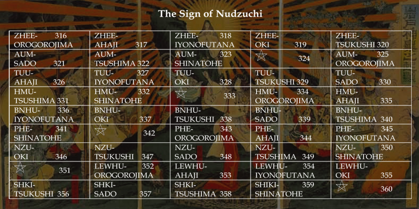 There are eight months in the Calendar of Mu, sometimes referred to as the Nyarzirian Calendar. Each month consists of forty-five days and represents a system of the eight hexagrams moving through the five elements. The Ninzuwu Priest/Priestess invokes the mudra/mantra formula associated with each hexagram that rules a particular day after invoking the Armor of Amaterasu Ohkami. The chart below illustrates the daily Vasuh letters invoked and the ruling “deity” for the said hexagram: