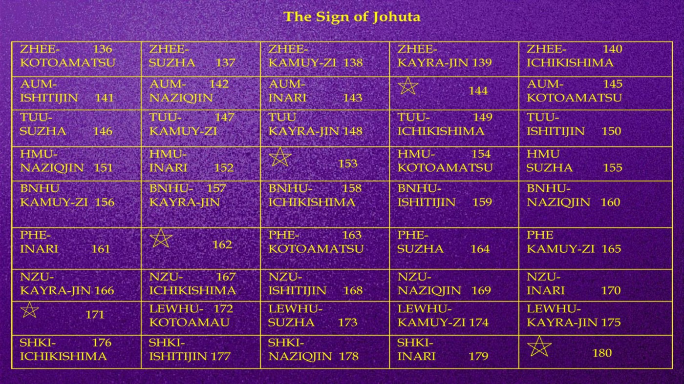 There are eight months in the Calendar of Mu, sometimes referred to as the Nyarzirian Calendar. Each month comprises forty-five days and represents a system of the eight hexagrams moving through the five elements. The Ninzuwu Priest/Priestess invokes the mudra/mantra formulae associated with each hexagram that rules a particular day after invoking the Armor of Amaterasu Ohkami. The chart below illustrates the daily Vasuh letters invoked and the ruling “deity” for the said hexagram:
