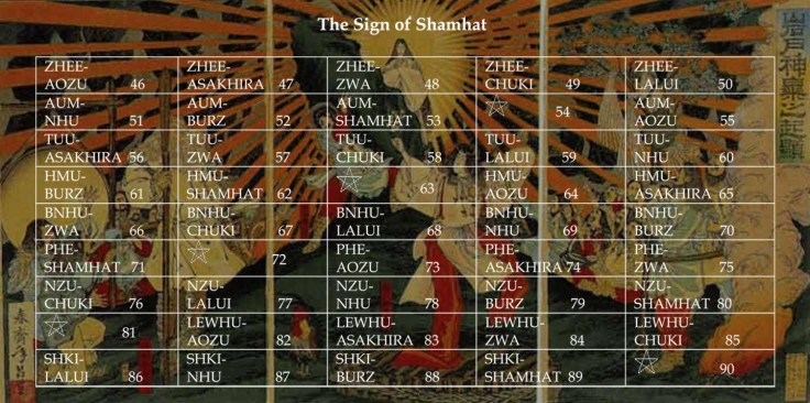 There are eight months in the Calendar of Mu, sometimes referred to as the Nyarzirian Calendar. Each month consists of forty-five days and represents a system of the eight hexagrams moving through the five elements. The Ninzuwu Shaman invokes the mudra/mantra formula associated with each hexagram that rules a particular day after invoking the Armor of Amaterasu Ohkami. The chart below illustrates the daily Vasuh letters invoked and the ruling “Ninzuwu” for the said hexagram: